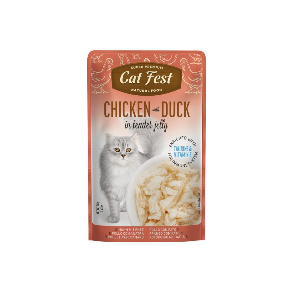 وجبة من فيليه الدجاج والبط المختار، المطهو ​​على البخار بإتقان، هي عرضنا الأمثل لعشاق الطعام. لن يقاوم حيوانك الأليف مزيج الدجاج الطري والبط المطهو ​​بإتقان، كل قطعة مغلفة بأناقة بطبقة رقيقة من الهلام.
