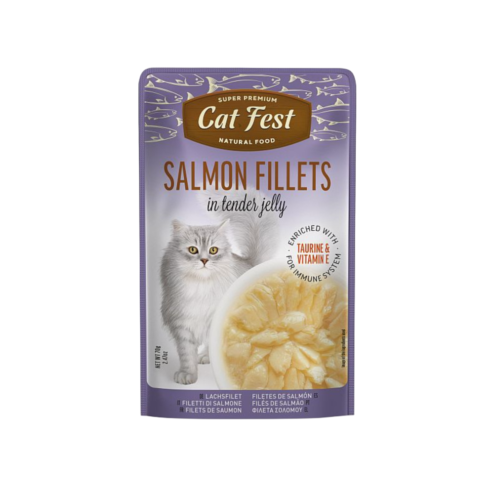 فيليه سمك السلمون في جيلي رقيق للقطط، متعة حقيقية لرفقائك الرقيقين. كل قطعة مختارة بعناية من سمك السلمون العصير غنية بأحماض أوميغا 3 الدهنية، مما يعزز صحة الجلد والفرو. يساعد هذا الجيلي اللطيف على الشعور بالشبع التام مع ضمان توازن مثالي للترطيب في نظام قطتك الغذائي.