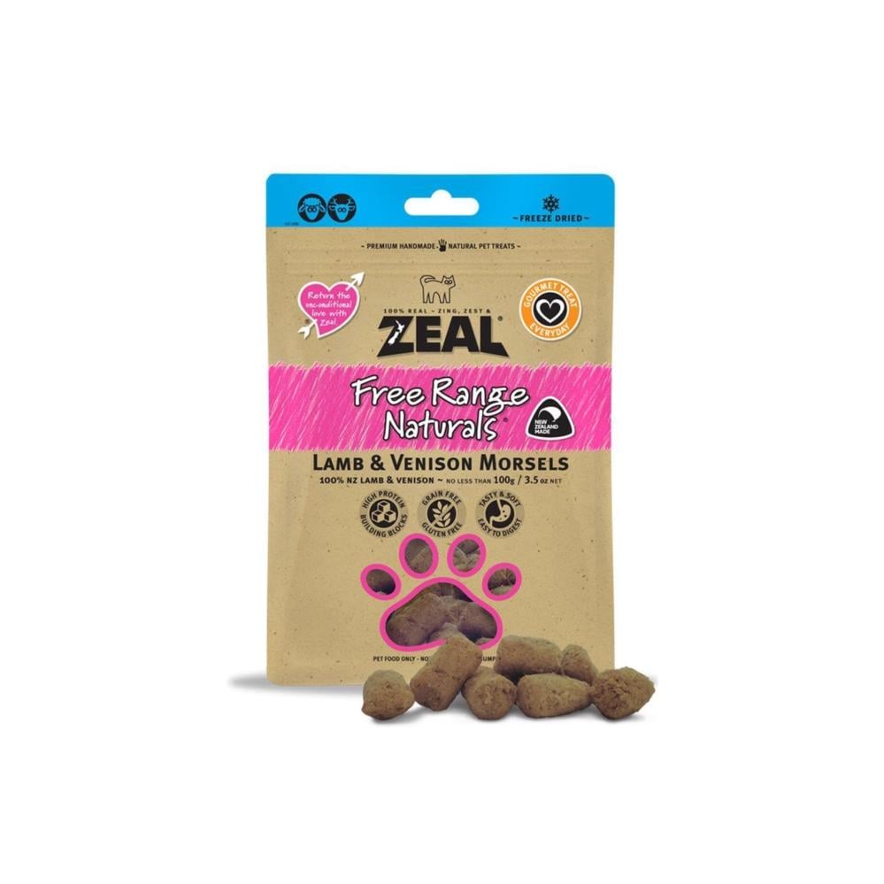 تعتبر قطع الغزال ولحم الضان الطبيعية من Zeal Free Range Naturals (100 جرام) وجبة خفيفة لذيذة وناعمة وصحية للقطط والكلاب من جميع الأحجام، وهي مصنوعة من المنتجات طبيعية 100%. تحتوي هذه الوجبة الخفيفة الطبيعية على نسبة عالية من البروتين وخالية من الجلوتين، وهي مصنوعة من لحم الضأن والدجاج النيوزيلندي 100%.