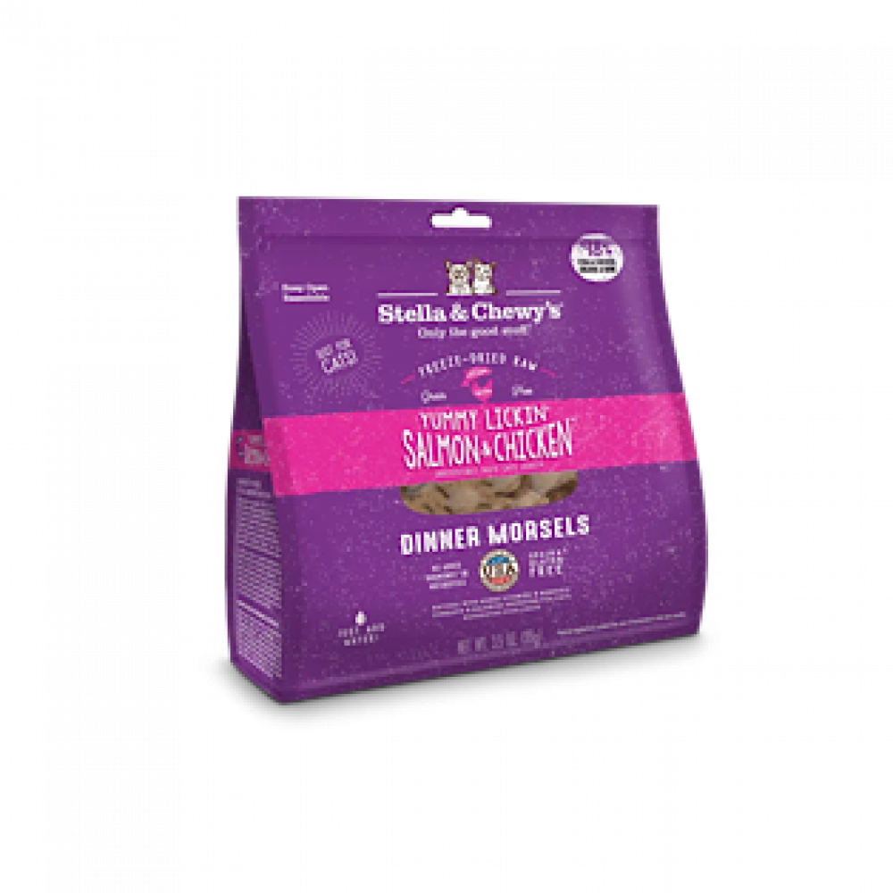 طعام ستيلا اند تشيوي المجفف بالتجميد يتكون من مصدر بروتين نقي بحيث تتكون من 98% من اللحوم والأعضاء والعظام غالباً ما تكون مصدراً واحد من البروتين النقي