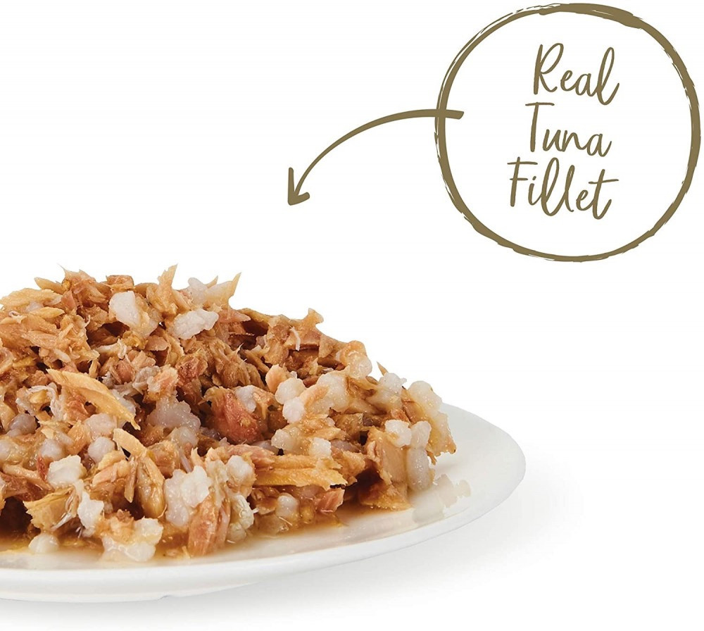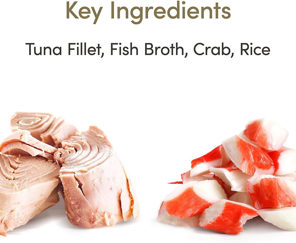 تحتوي على سمك التونا مع السلطعون في المرق وهي غذاء تكميلي طبيعي 100٪ للقطط البالغة.