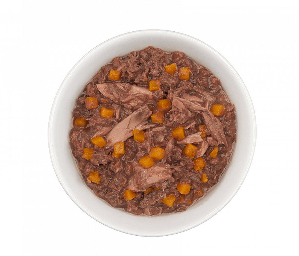 المكونات الخالية من الحبوب والبطاطس غير المعدلة وراثيًا المكون الأول هو التونة البرية.