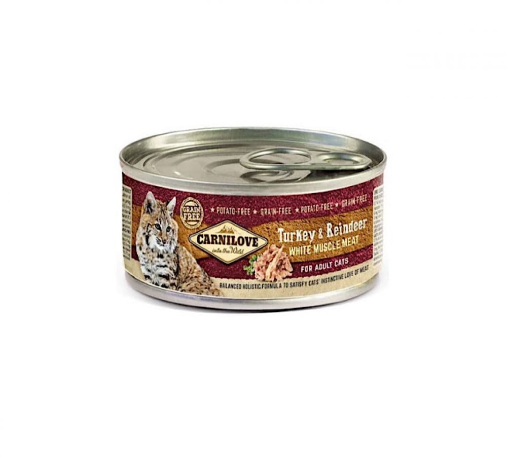 يحتوي طعام كارنيلوف للقطط الرومي والرنة على 55٪ من اللحوم البرية (لحم العضلات البيضاء) وهو طعام كامل خالٍ من الحبوب والبطاطس.