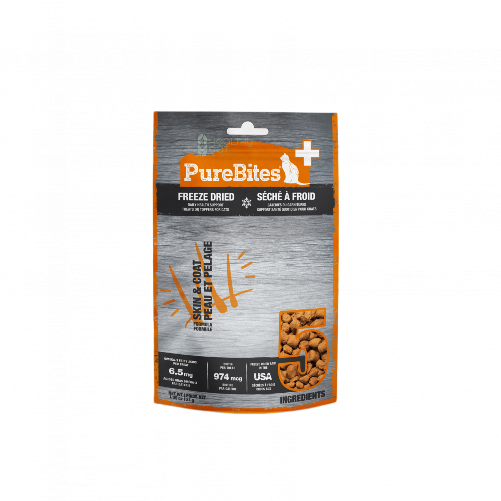 هيا، انظر إلى مكوناتنا؛ يتم تصنيع منتجات PureBites+ الوظيفية للبشرة والمعطف باستخدام 5 مكونات من الدرجة البشرية فقط: 100% دجاج نقي، وجزر، وسمك السلمون، ومستخلص إكليل الجبل، والبيوتين. مصدر بفخر وصُنع في الولايات المتحدة الأمريكية