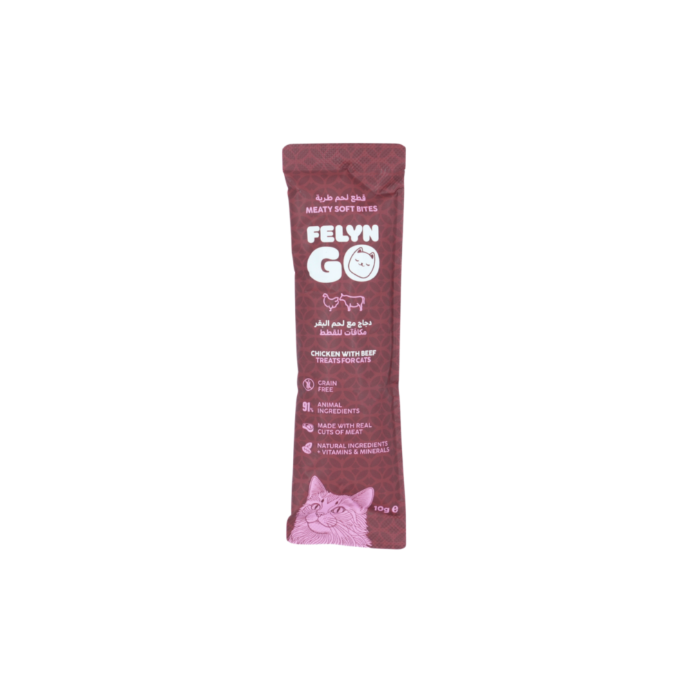 فيلاين قو سوفت بايت دجاج واللحم البقري، خالية من الحبوب، مصنوعة من 91٪ لحم ودجاج وتونة حقيقية مع تورين. مثالية للمكافأة أو التدريب أو إعطاء الدواء
