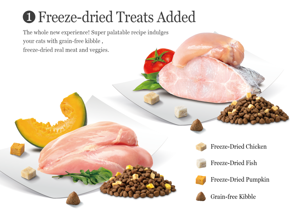 Chicken flour, pea protein, tapioca flour, chicken hydrolysate, beef tallow, sweet potato powder, digested animal protein, cellulose fiber, freeze-dried chicken, freeze-dried pumpkin, meat and bone meal, salmon oil, poultry fat, potassium chloride, dicalcium phosphate, essential vitamin supplements (vitamin A, vitamin D3, vitamin E, vitamin C, nicotinic acid, vitamin B1, vitamin B6, pantothenic acid, vitamin B2, vitamin K3, folic acid, biotin, vitamin B12), essential trace mineral supplements (iron, zinc, copper, manganese, iodine, selenium), choline chloride, sunflower oil, dried green peas, salt, monosodium phosphate, methionine, taurine, mannan oligosaccharide, bacillus subtilis, fructooligosaccharide, apple powder, spinach powder, tomato powder, evening primrose oil, enzyme, shark cartilage powder, propionic acid, glucomannan Mystery, Yucca Schidigera Extract, Natural Mixed Tocopherols.