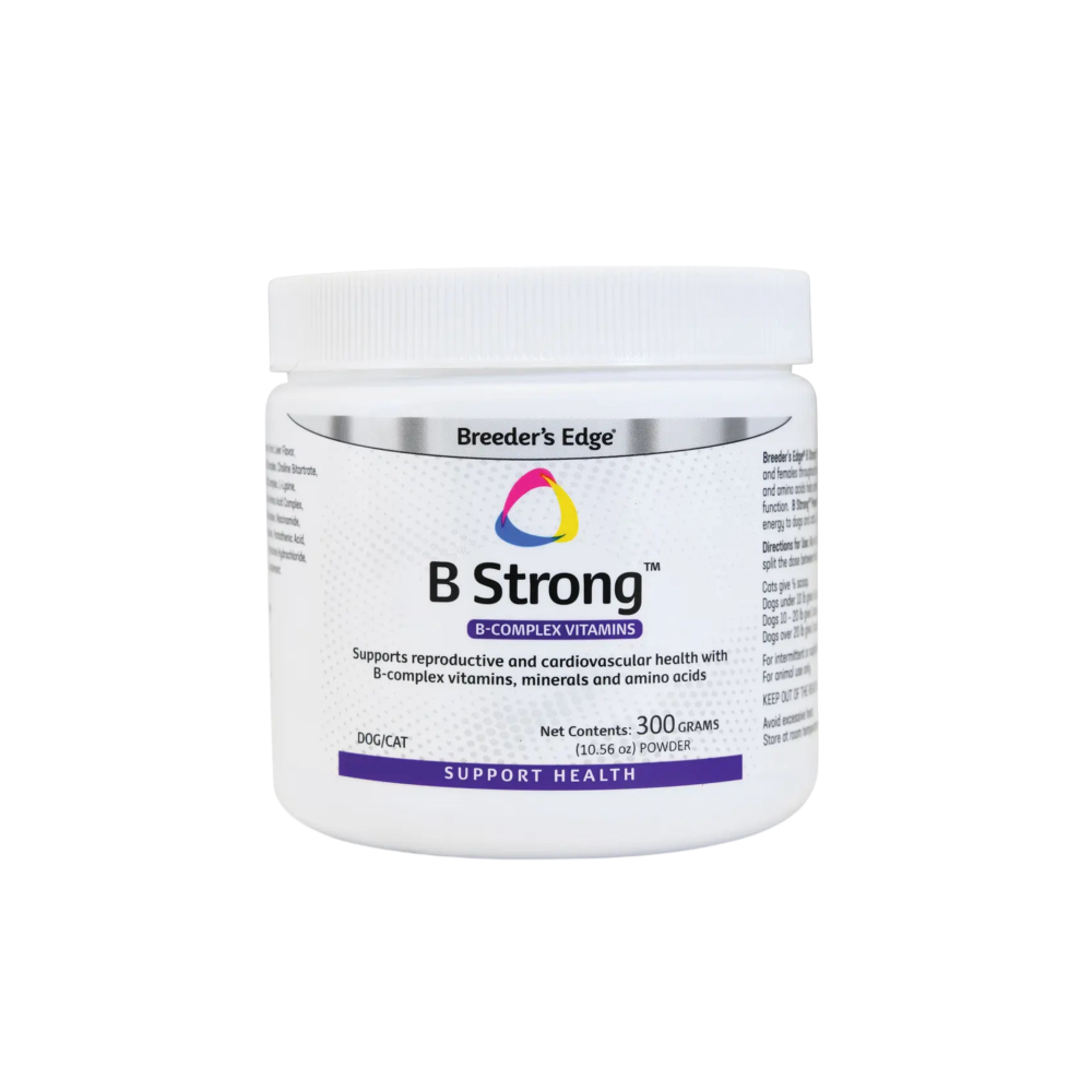 Breeder's Edge® B Strong™ provides a boost of energy and helps stimulate the appetite of puppies and kittens, as well as adult cats after illness or surgery. This liquid B vitamin for dogs and cats comes as a ready-to-use formula and is ideal for picky cats. The liquid is chicken-flavored, and a 1 ml dose can be administered alone, via syringe, or mixed with canned food or liquid milk replacers. The powder is liver-flavored and can be easily sprinkled over dry pet food.