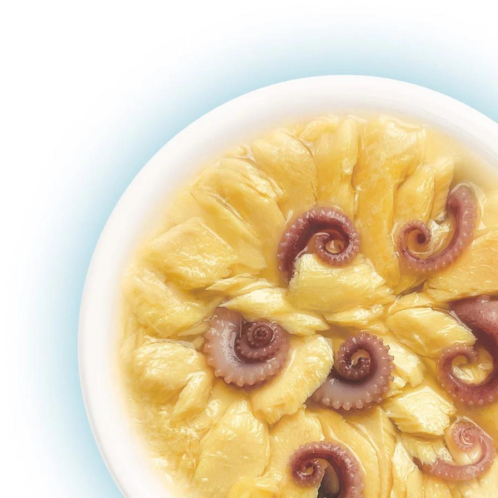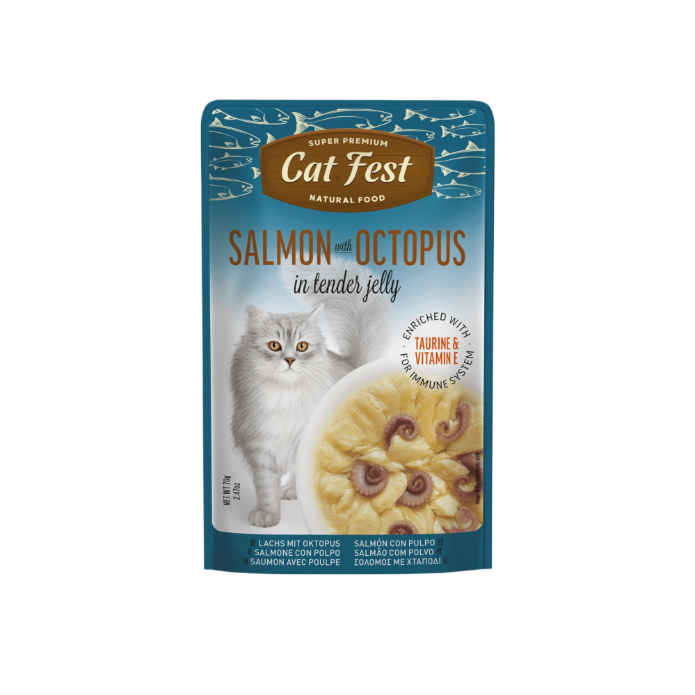 Salmon and Octopus in Jelly for Cats is not just a treat, it's a true masterpiece, prepared with love and care for your pet. Rich in omega-3 fatty acids, protein, and minerals from delicious seafood, this recipe is specially designed to promote healthy skin and coat, as well as maintain their immunity and overall physical health.