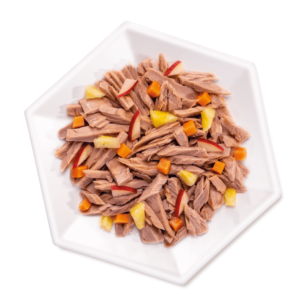 Premium tuna steaks with papaya, pineapple, and apple. Everything is steamed and preserved in a soft vegetable jelly. No artificial colors, preservatives, or additives.