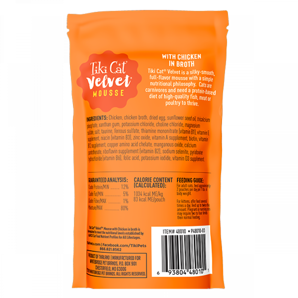 Chicken, Chicken Broth, Dried Eggs, Sunflower Seed Oil, Tricalcium Phosphate, Xanthan Gum, Potassium Chloride, Choline Chloride, Magnesium Sulfate, Salt, Taurine, Ferrous Sulfate, Thiamin Mononitrate (Vitamin B1), Vitamin E Supplement, Niacin (Vitamin B3), Zinc Oxide, Vitamin A Supplement, Biotin, Vitamin B12 Supplement, Copper Amino Acid Chelate, Manganese Oxide, Calcium Pantothenate, Riboflavin (Vitamin B2) Supplement, Sodium Selenite, Pyridoxine Hydrochloride (Vitamin B6), Folic Acid, Potassium Iodide, Vitamin D3 Supplement.