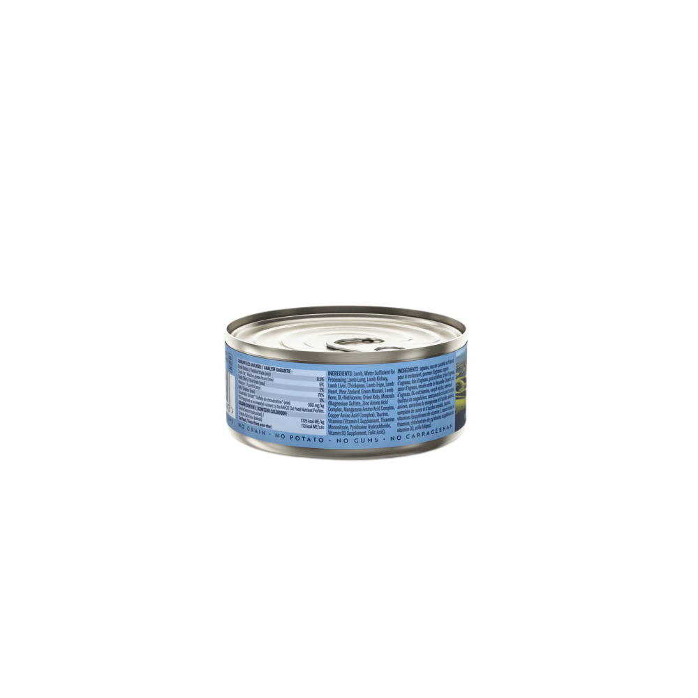 Lamb, Water Sufficient for Processing, Lamb Lung, Lamb Kidney, Lamb Liver, Chickpeas, Lamb Tripe, Lamb Heart, New Zealand Green Lipped Mussel, Lamb Bone, DL-Methionine, Dried Kelp, Minerals (Magnesium Sulfate, Zinc Amino Acid Complex, Manganese Amino Acid Complex, Copper Amino Acid Complex), Taurine, Vitamins (Vitamin E Supplement, Thiamine Mononitrate, Pyridoxine Hydrochloride, Vitamin D3 Supplement, Folic Acid).